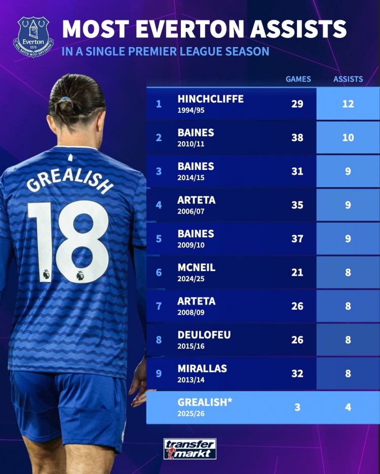 开局3场4助!格拉利什有望冲击埃弗顿队史英超单赛季12次助攻纪录