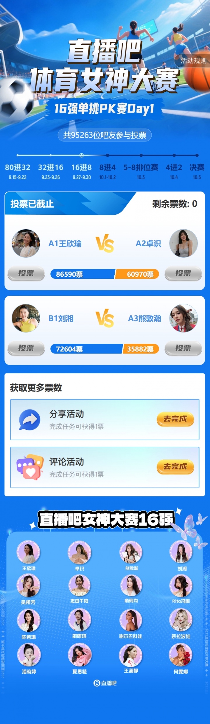 直播吧体育女神大赛16强赛Day1:王欣瑜淘汰卓识 刘湘击败熊敦瀚